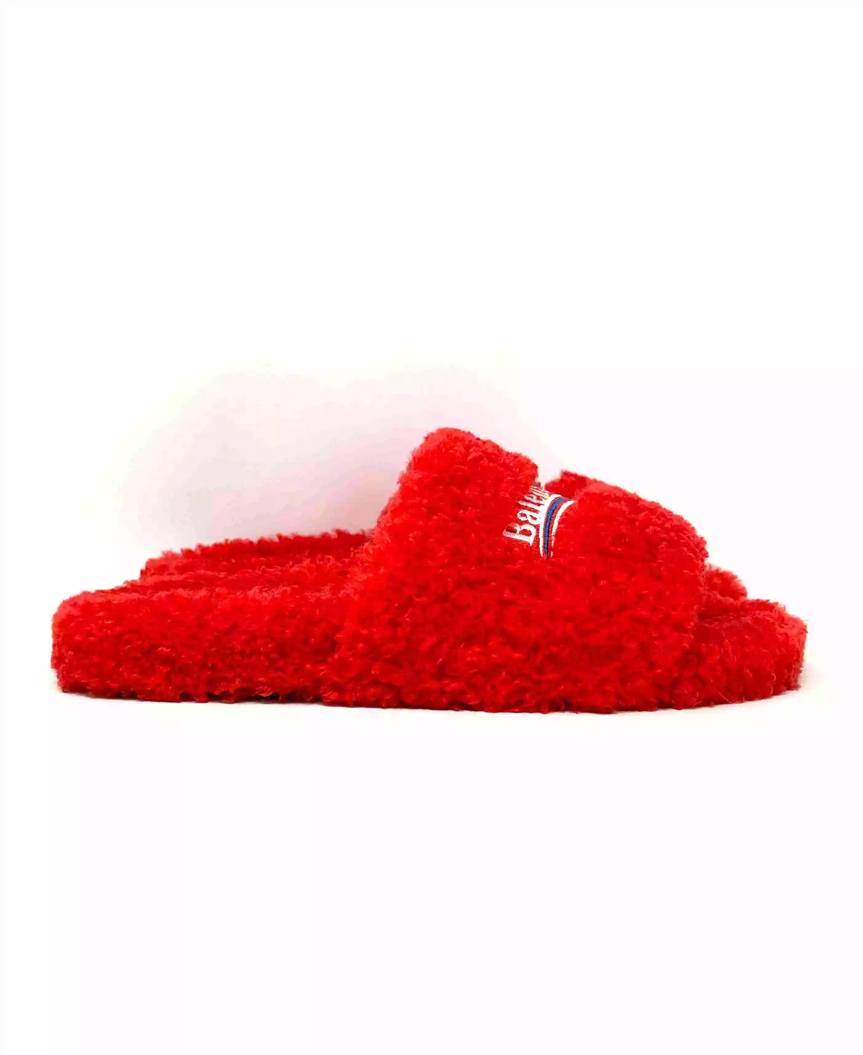 - Bright red faux shearling flat mule sandals with an embroidered brand’s Political Campaign logo on the strap, shoes feature a moulded footbed and an open round toe