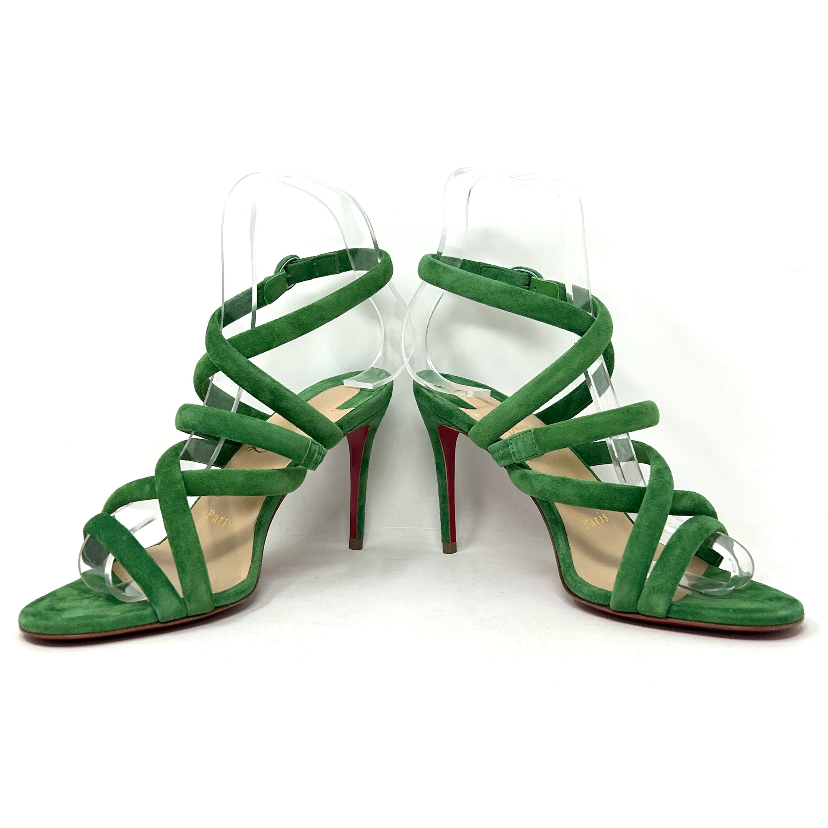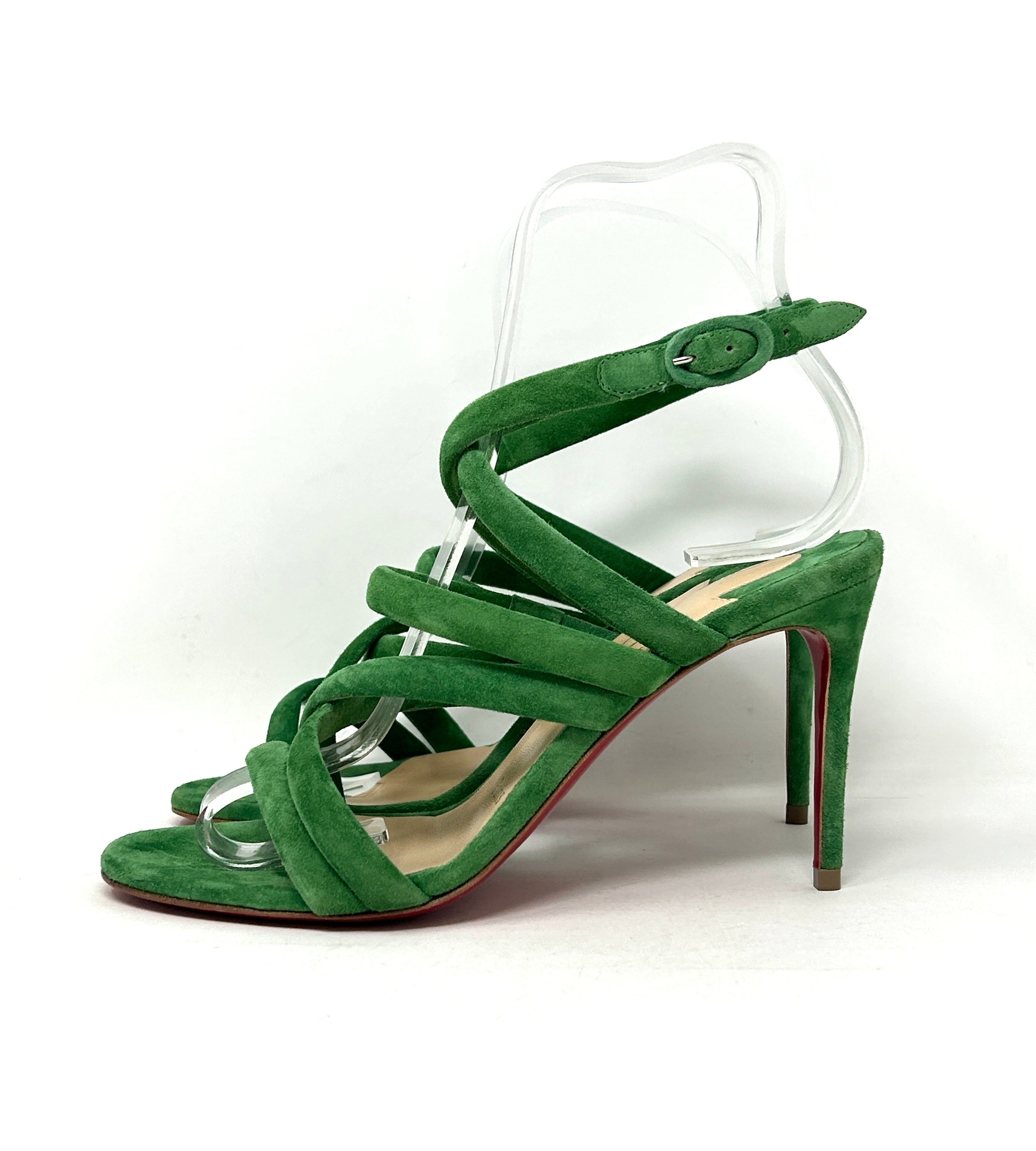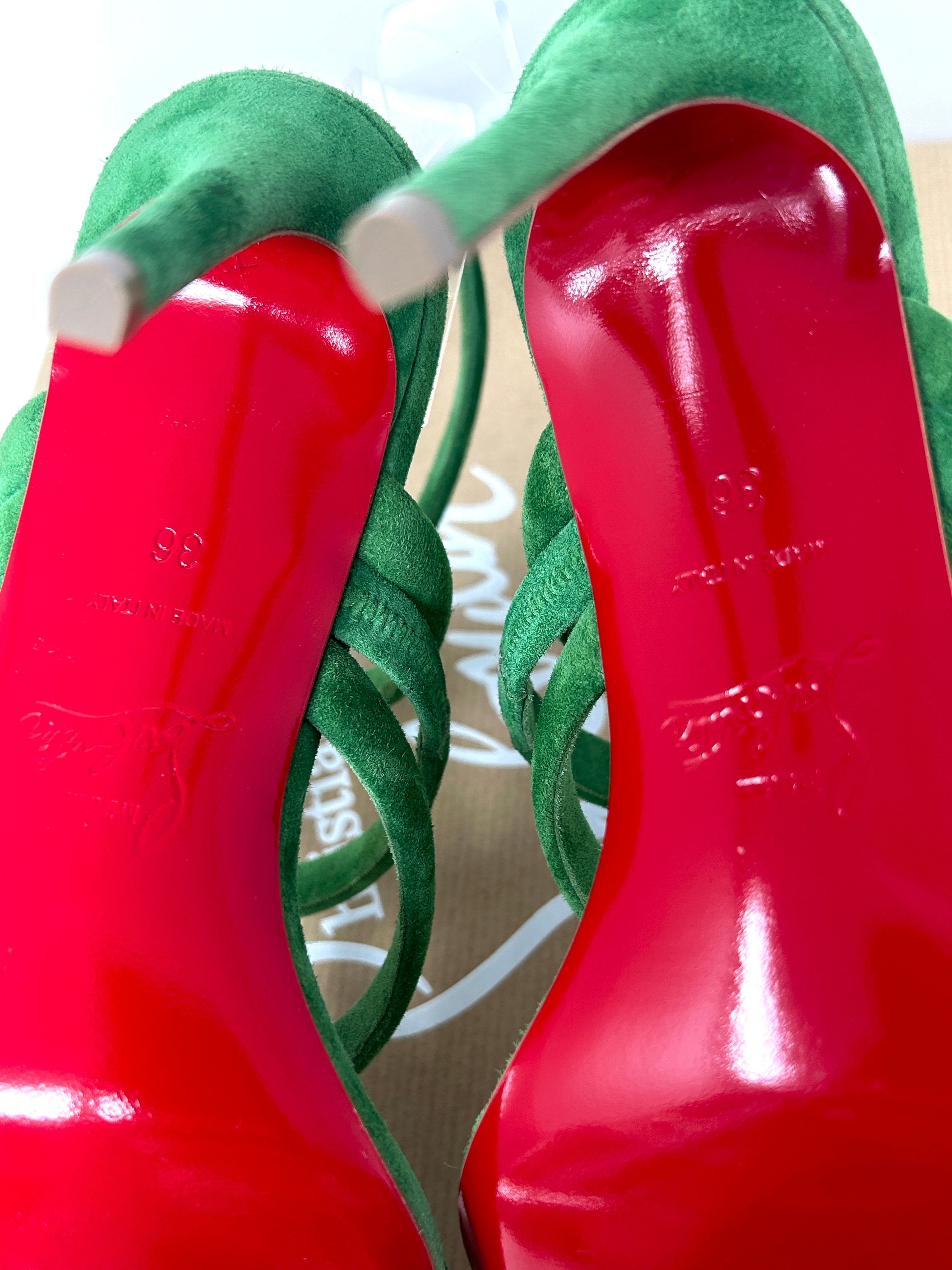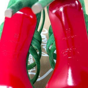 Tags: Christian Louboutin, Christian Louboutin heels, green, heel sandals, Heels, High Heel Hierarchy, High heels, never worn, new, red soles, Sandals, strappy, strappy heels, suede, Suede heels, suede leather, suede sandals