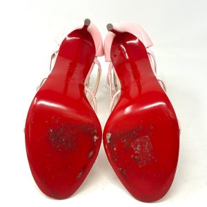 - Pink patent leather strappy heel sandals featuring elasticated and buckle straps, clear bubble accent detailing and the brand’s signature red soles