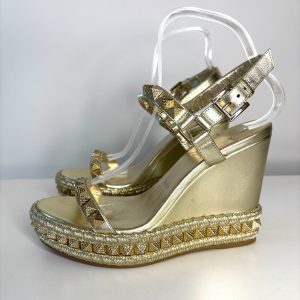 Be the first to review “Pre-owned Christian Louboutin Pyraclou Espadrille Gold Leather Studded Wedge Sandals 39 UK6” Cancel reply