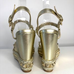 Pre-owned Christian Louboutin Pyraclou Espadrille Gold Leather Studded Wedge Sandals 39 UK6