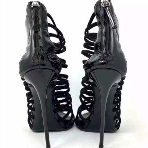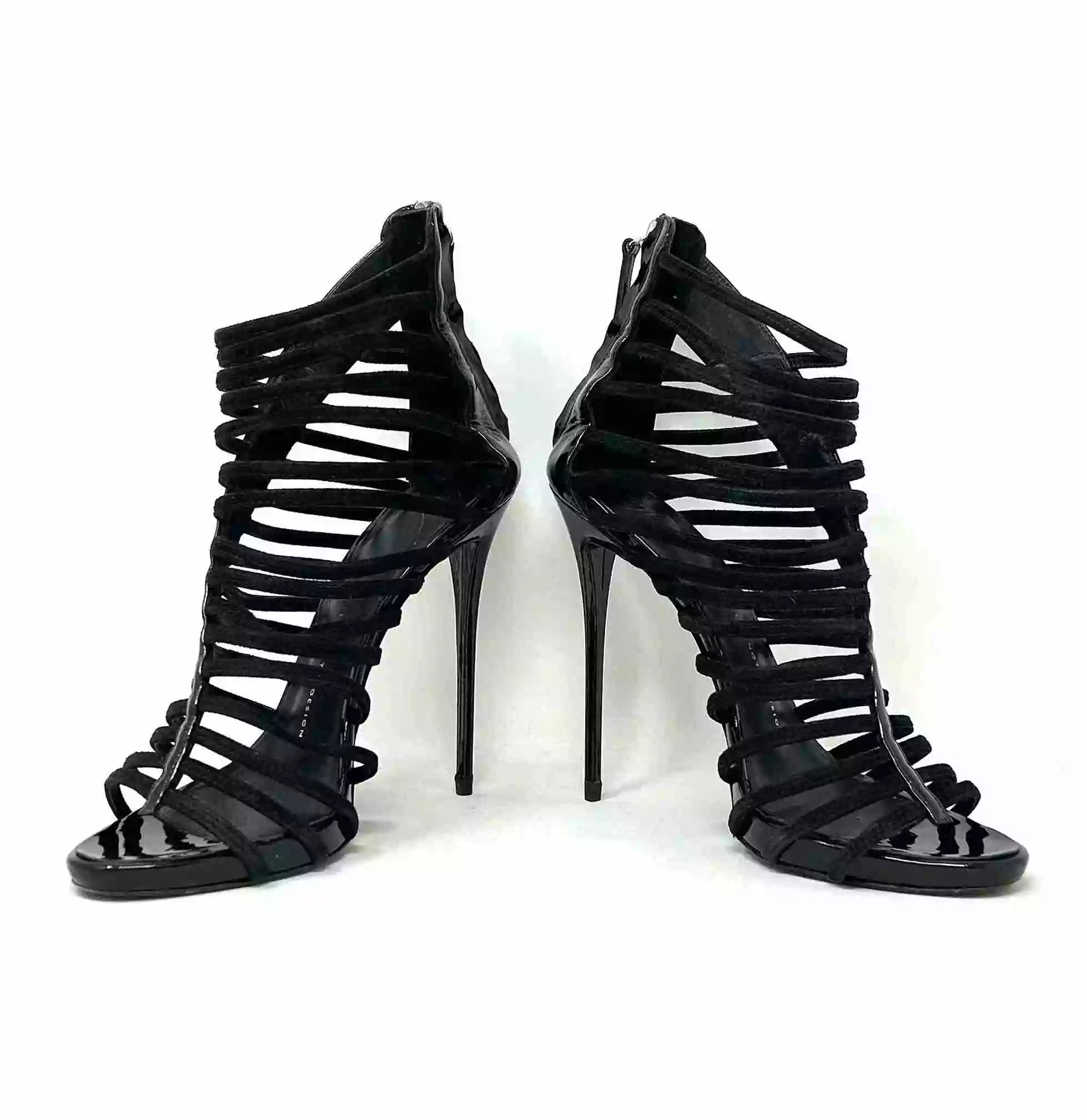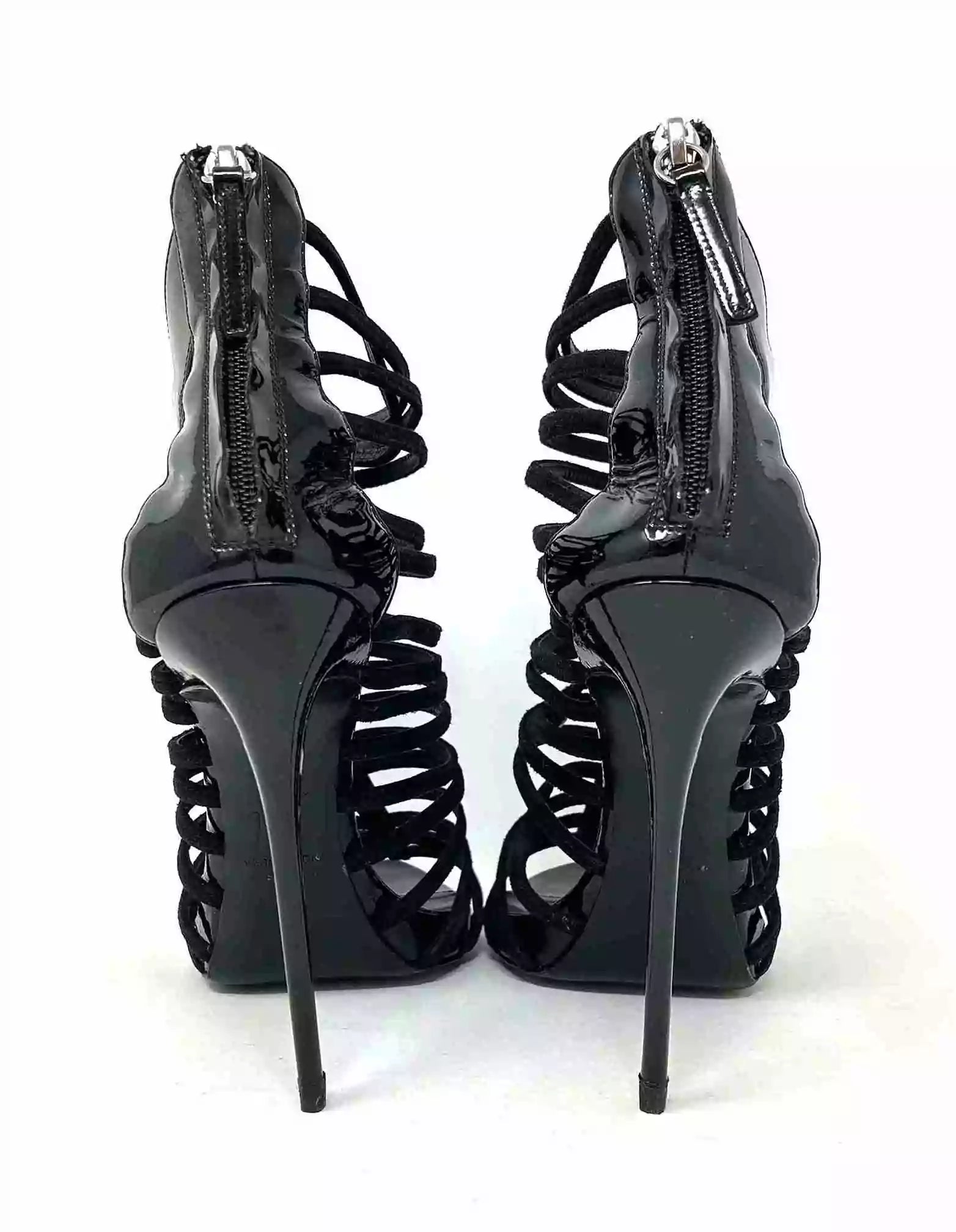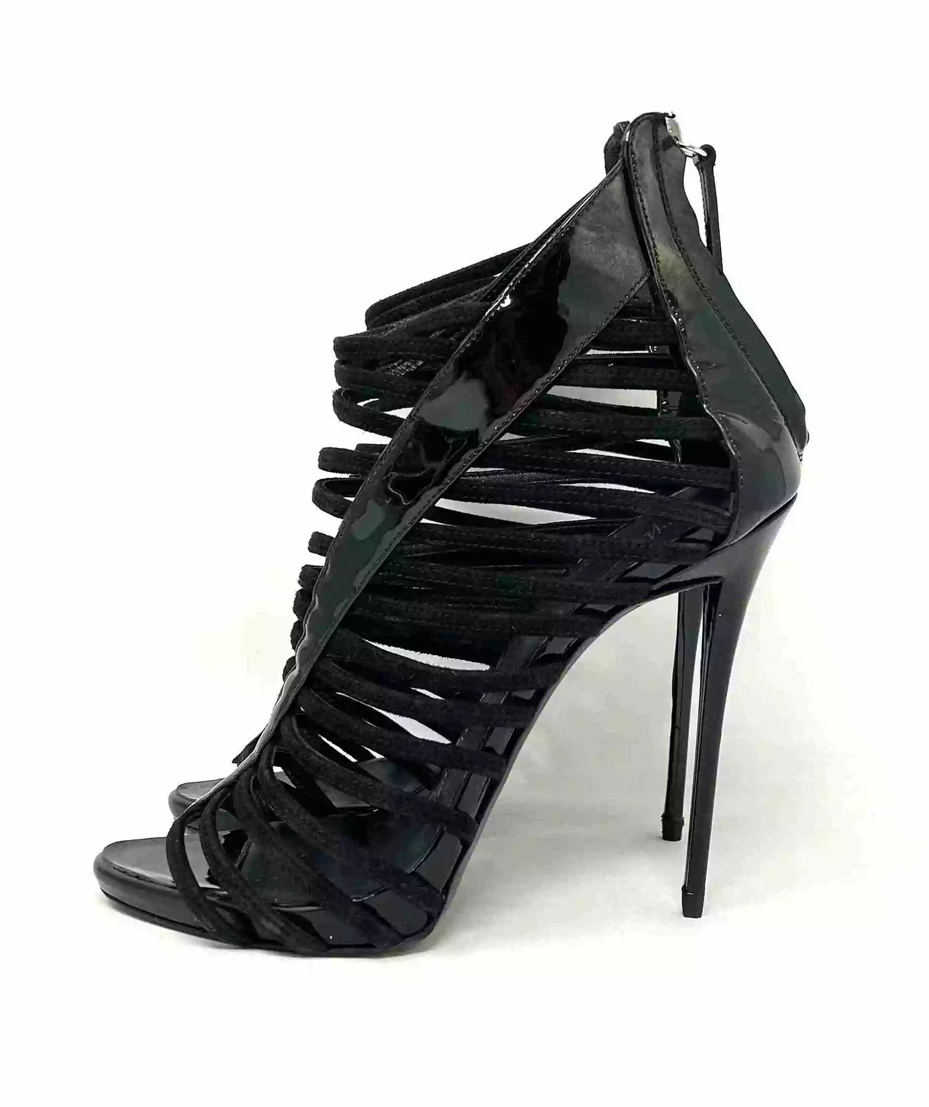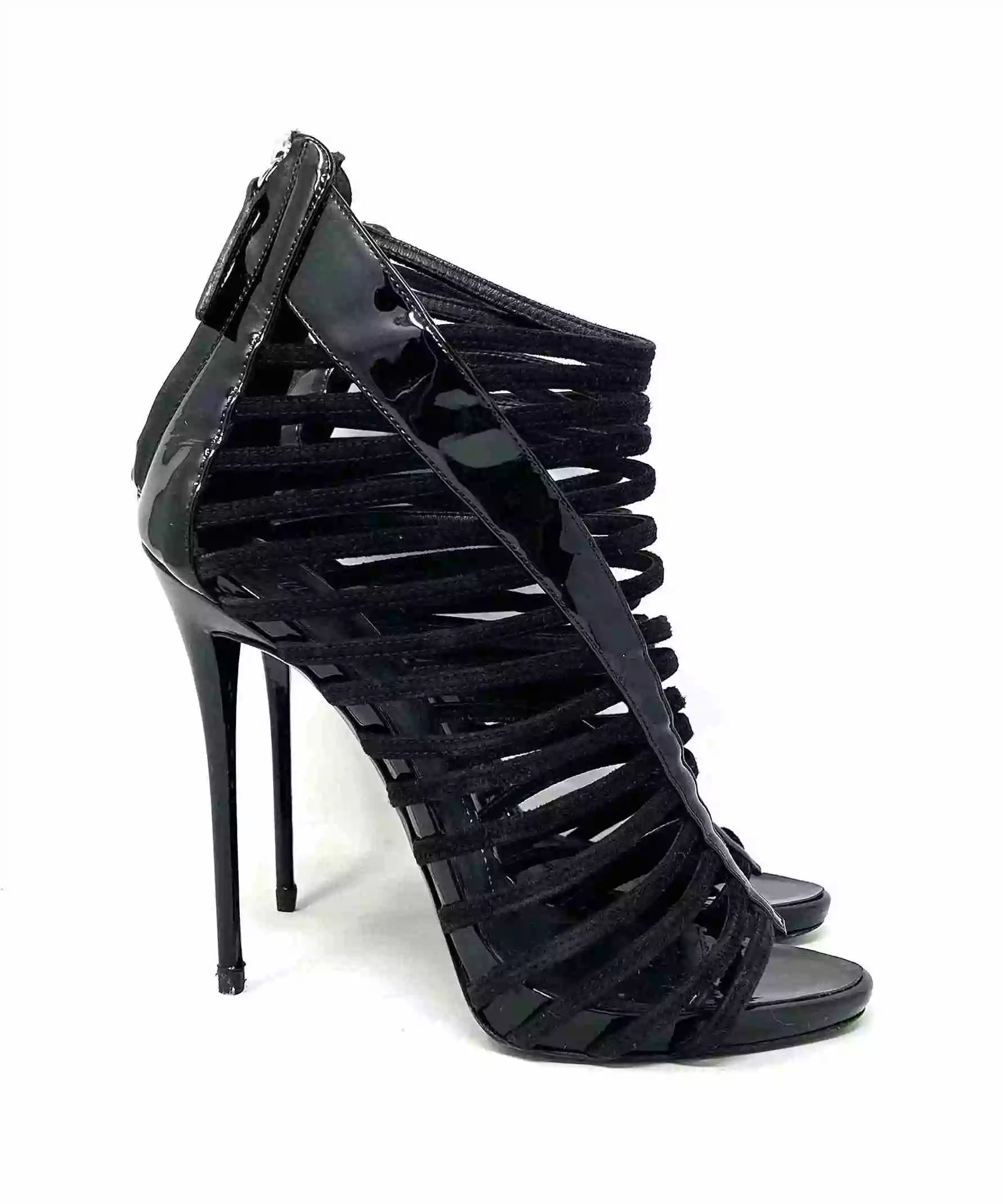 - Black heel sandals featuring suede strap cage design, patent leather trim detail, back zip closure and stiletto heels