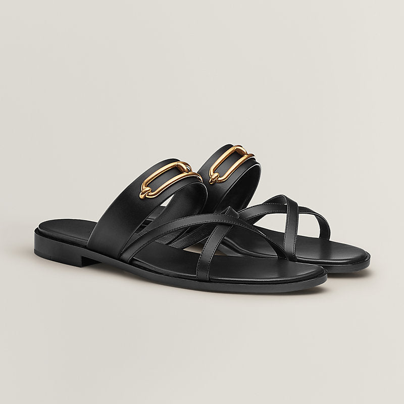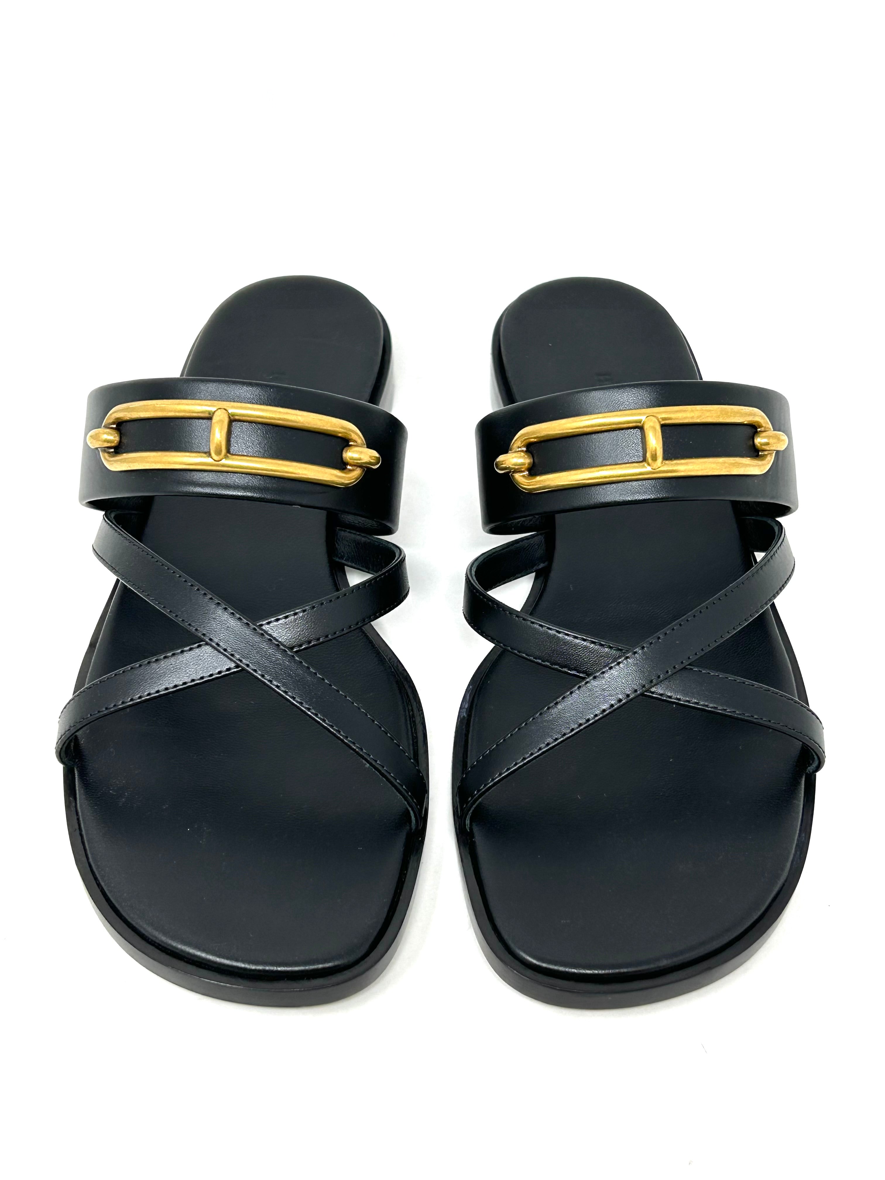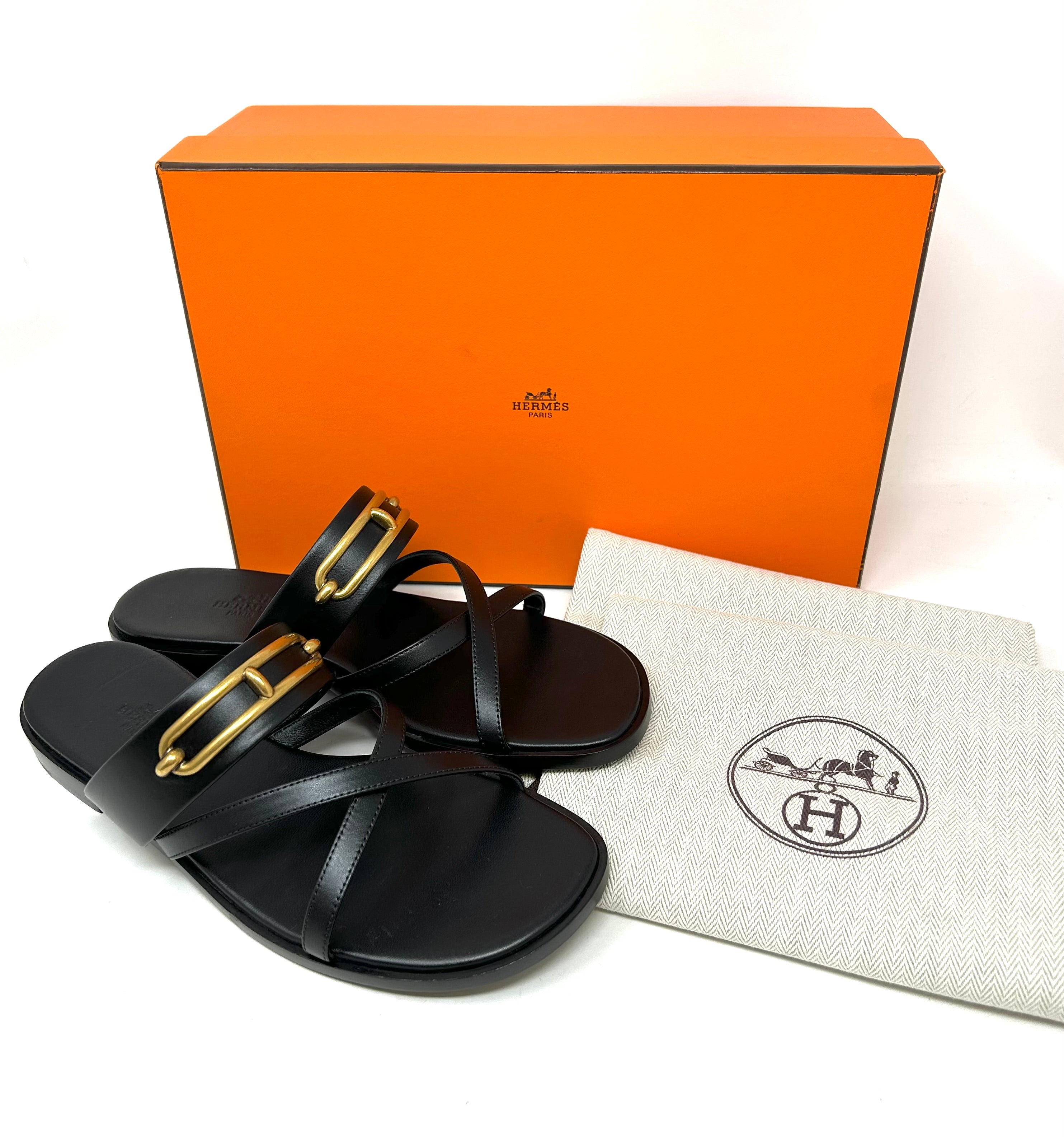 Tags: Black Leather, Flats, gold buckle, hermes, High Heel Hierarchy, never worn, new, Sandals