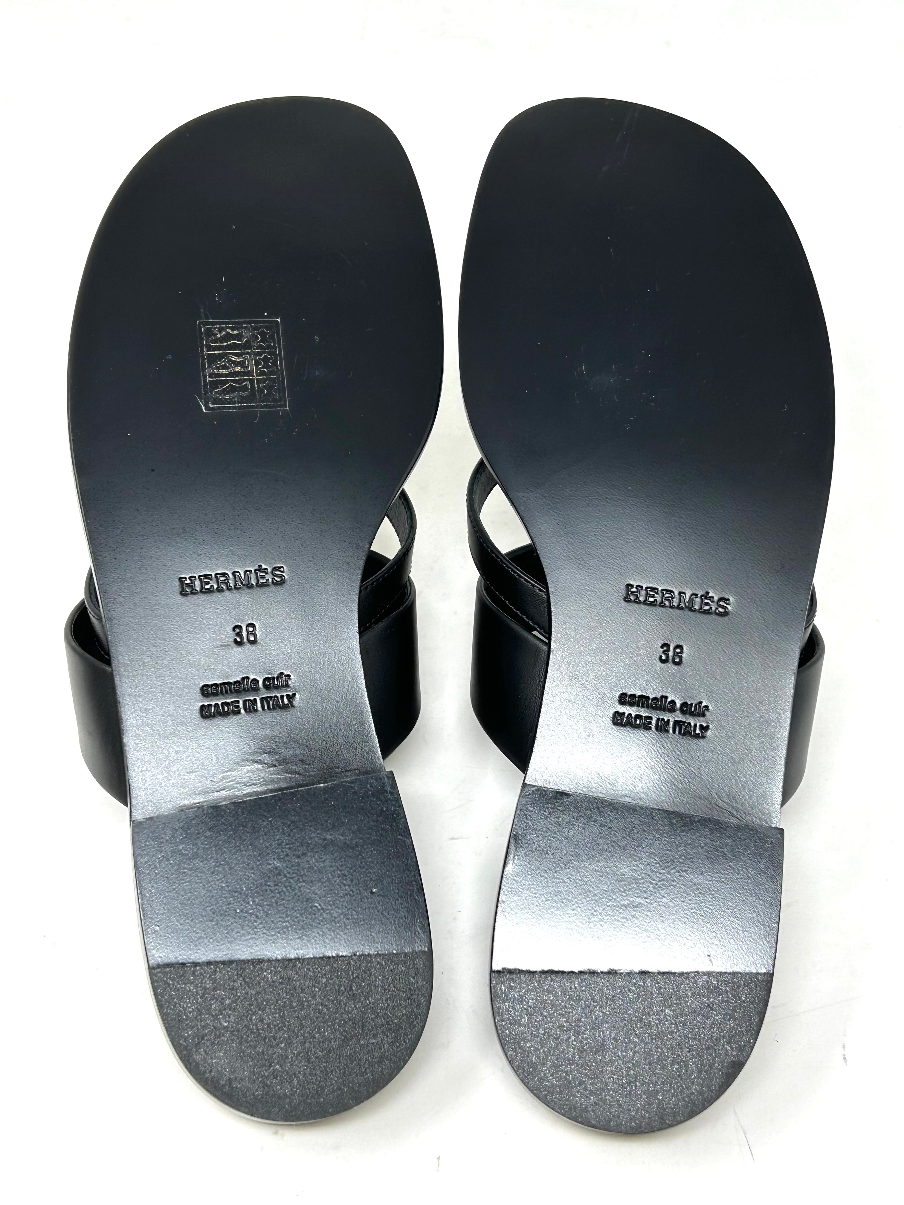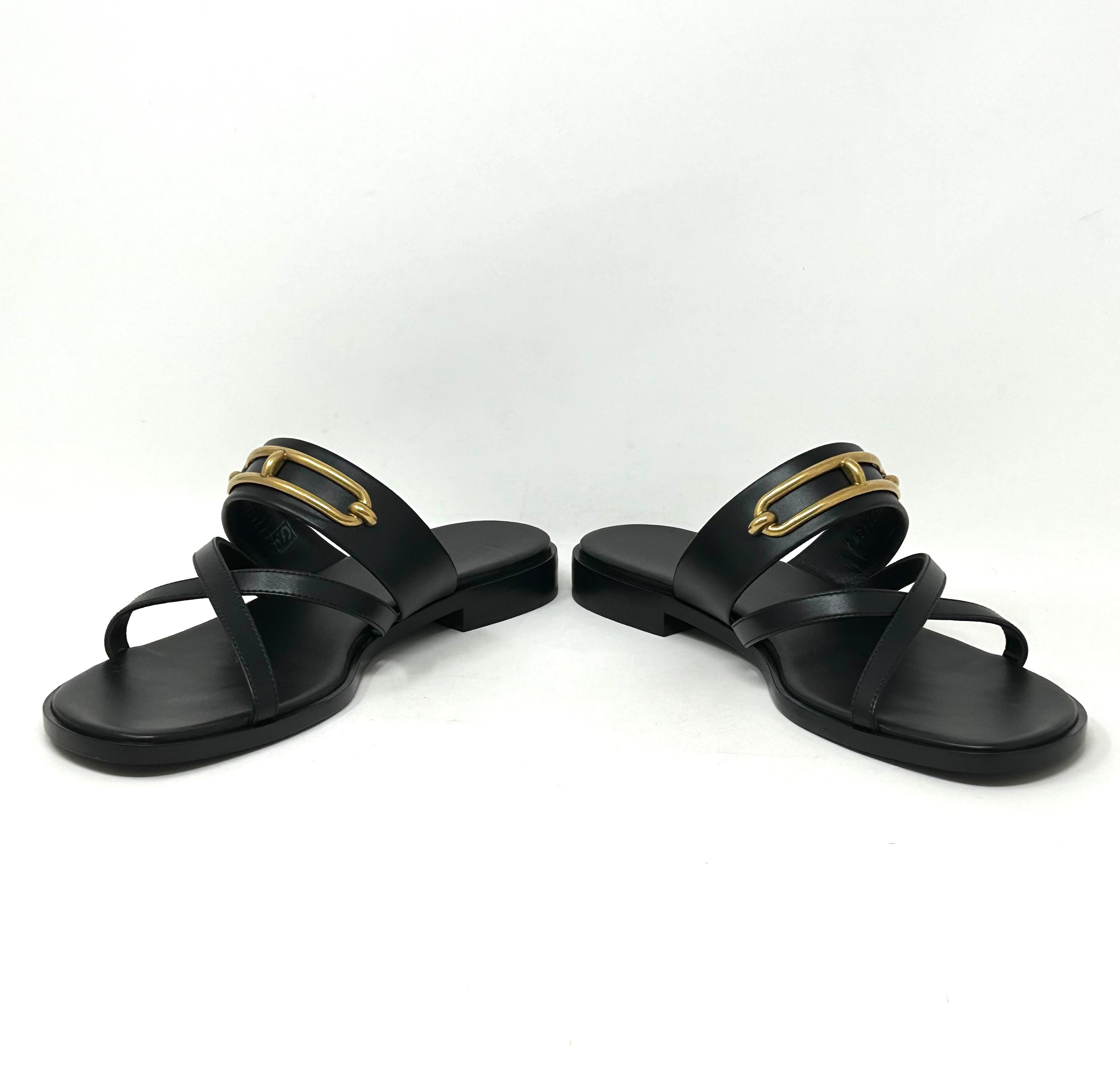 Hermes Claire Black Leather Aged Gold Buckle Sandals 38 UK 5
