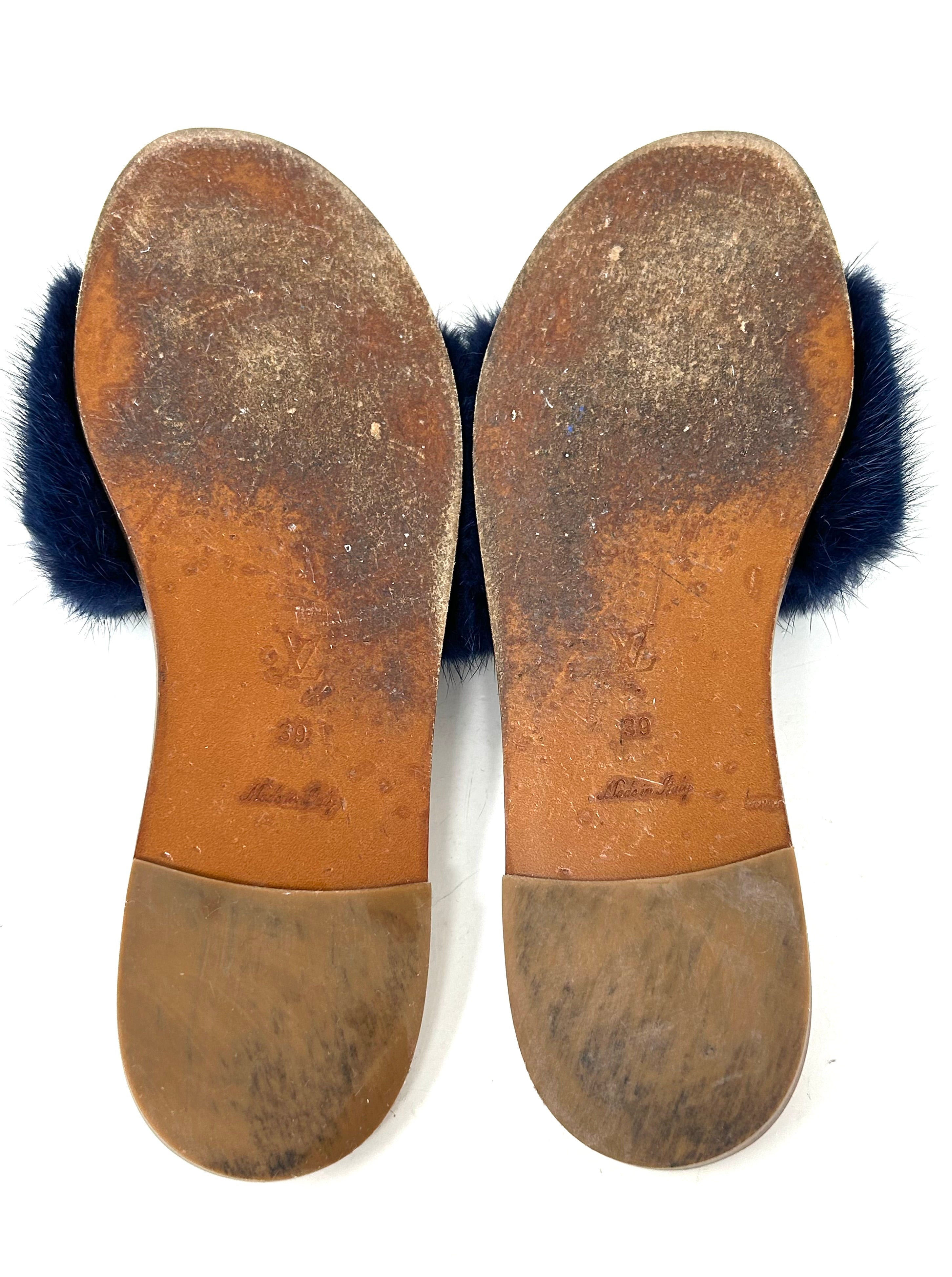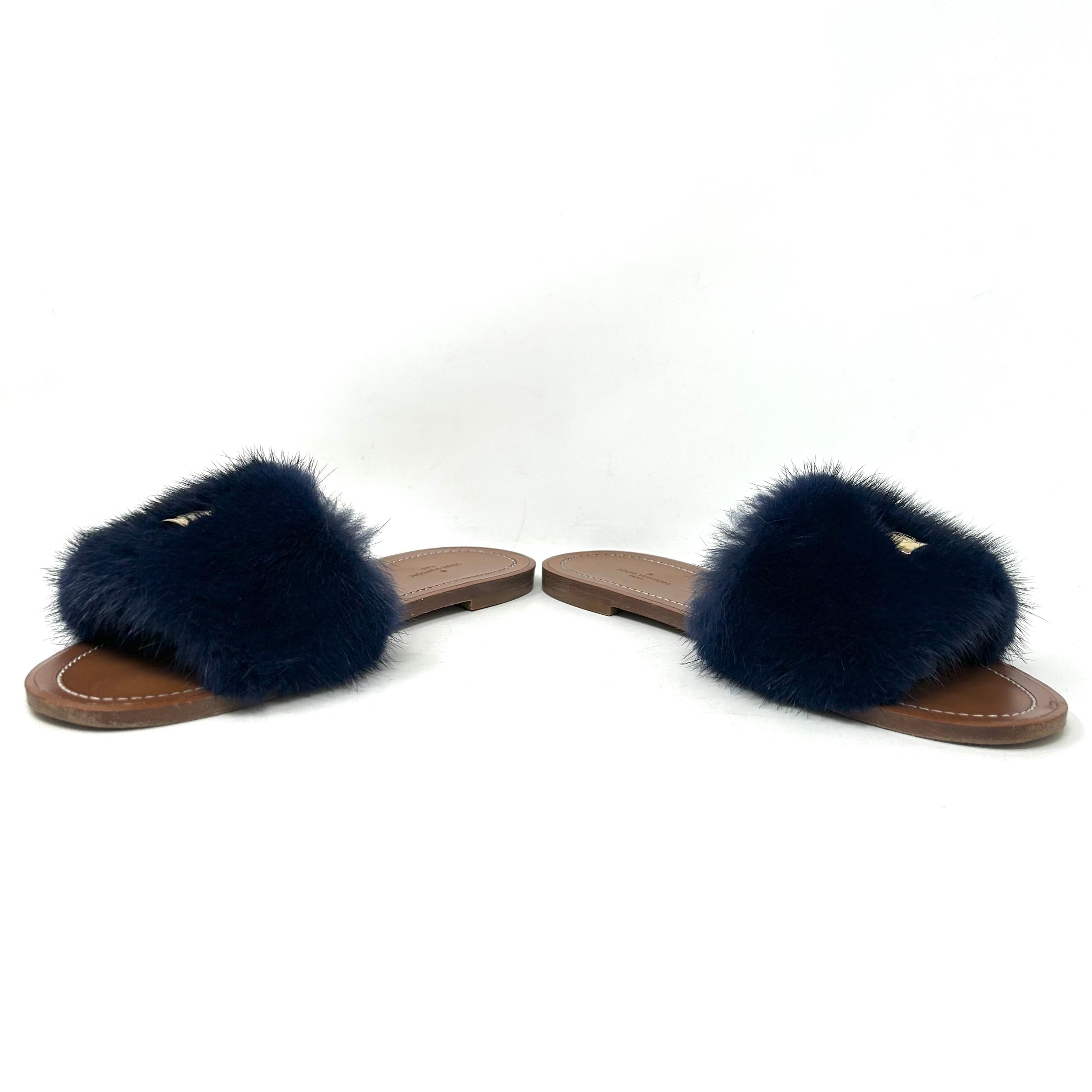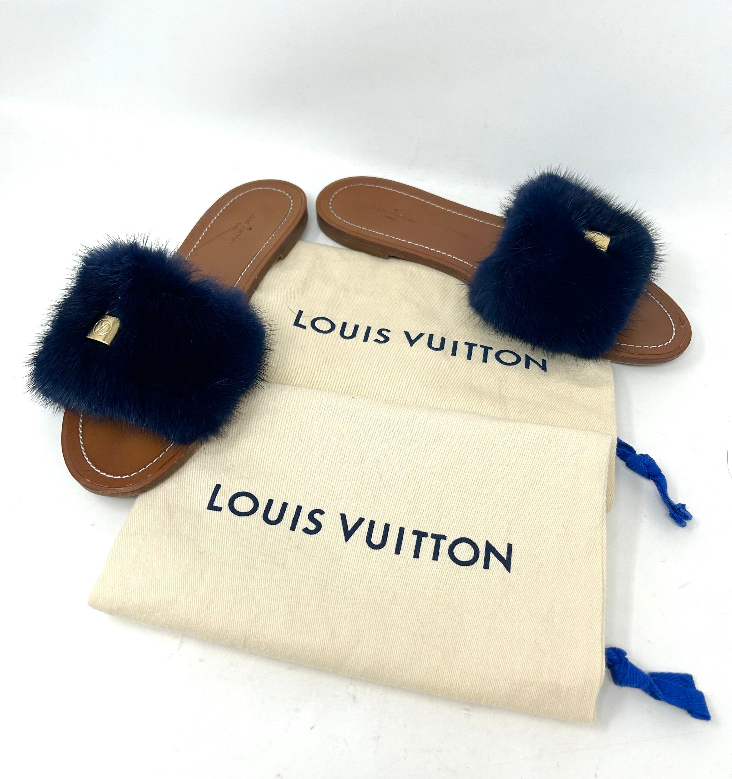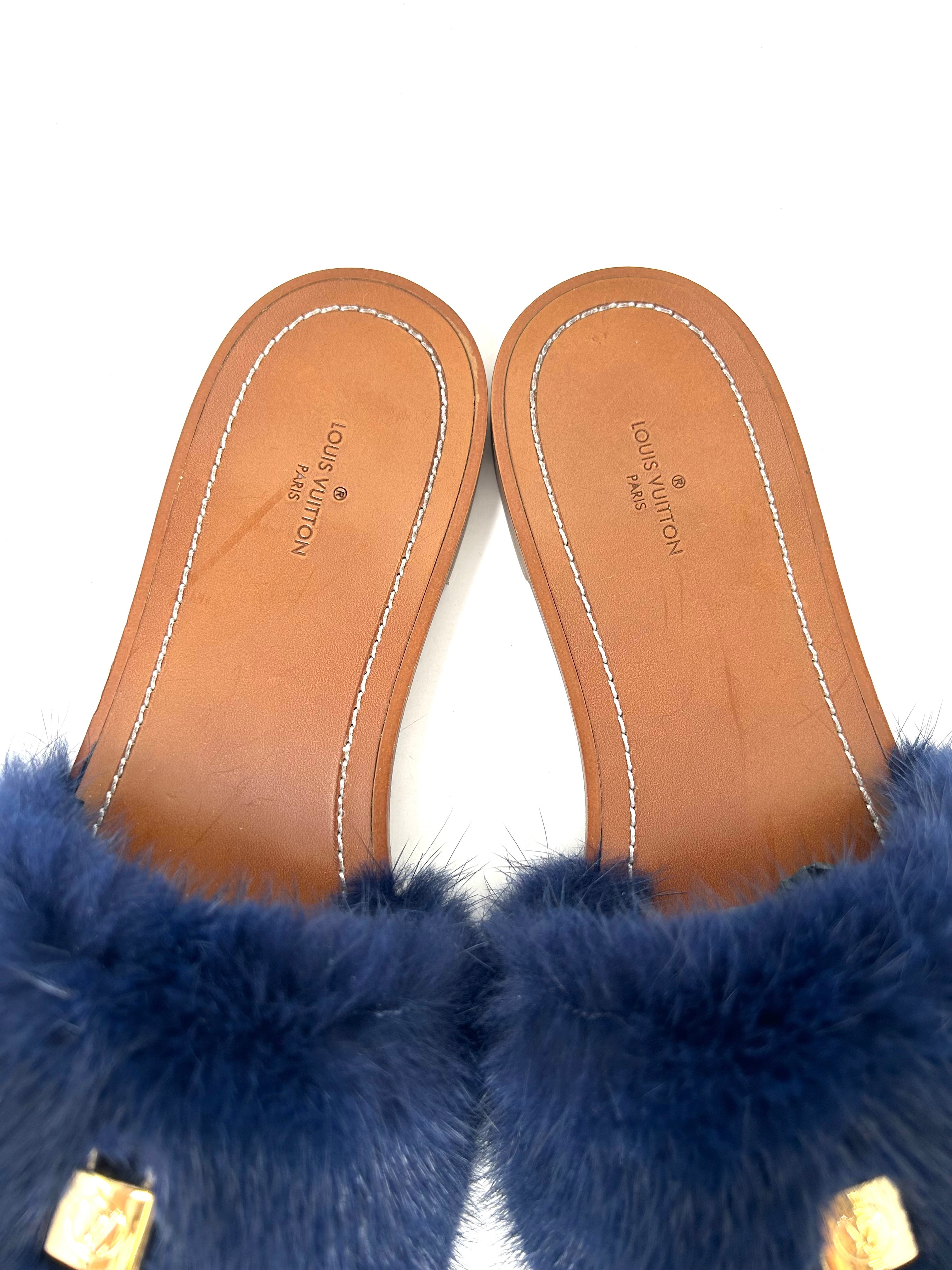 Louis Vuitton Lock It Brown Leather Dark Blue Mink Fur Slides Sandals 39 UK 6