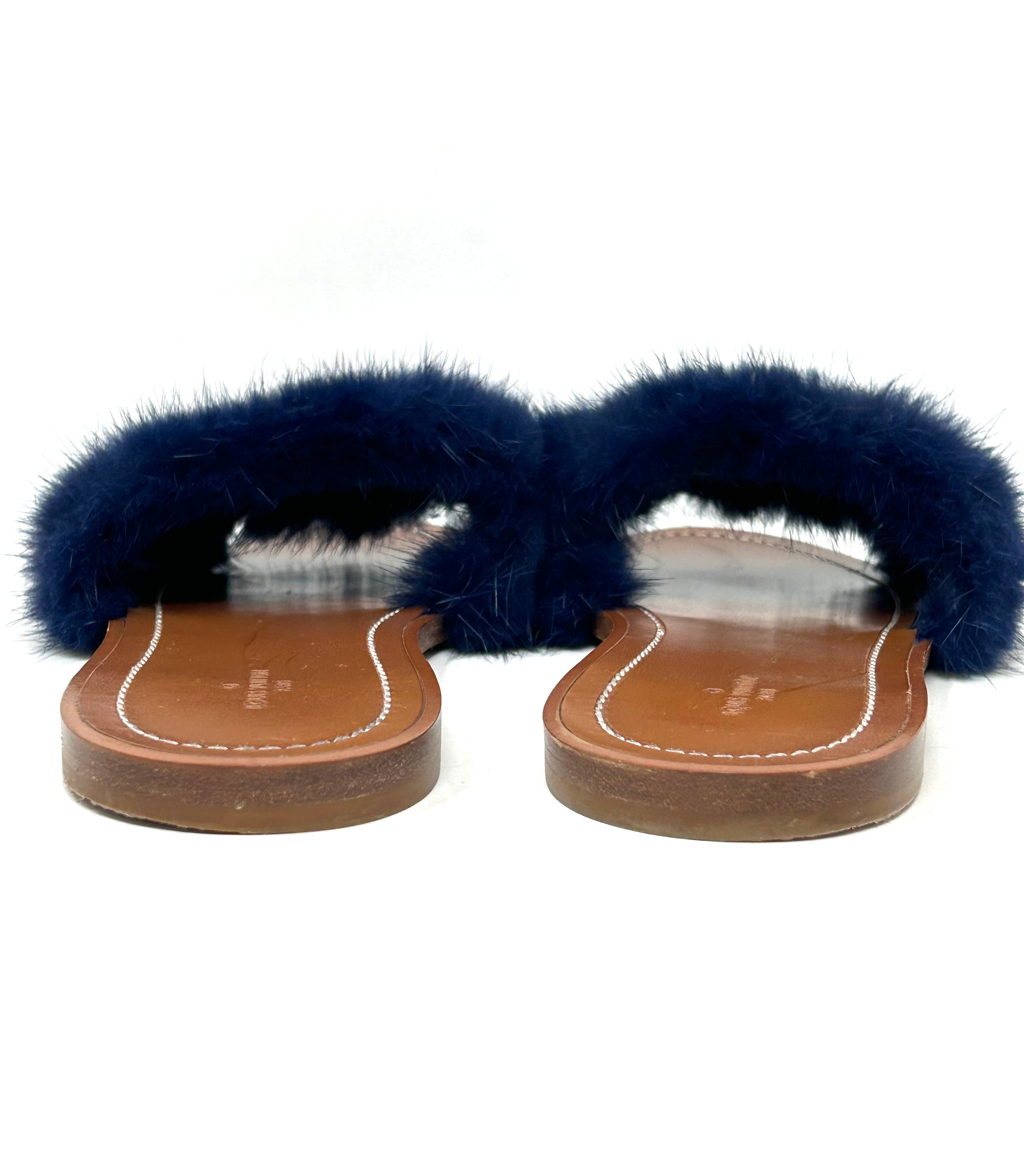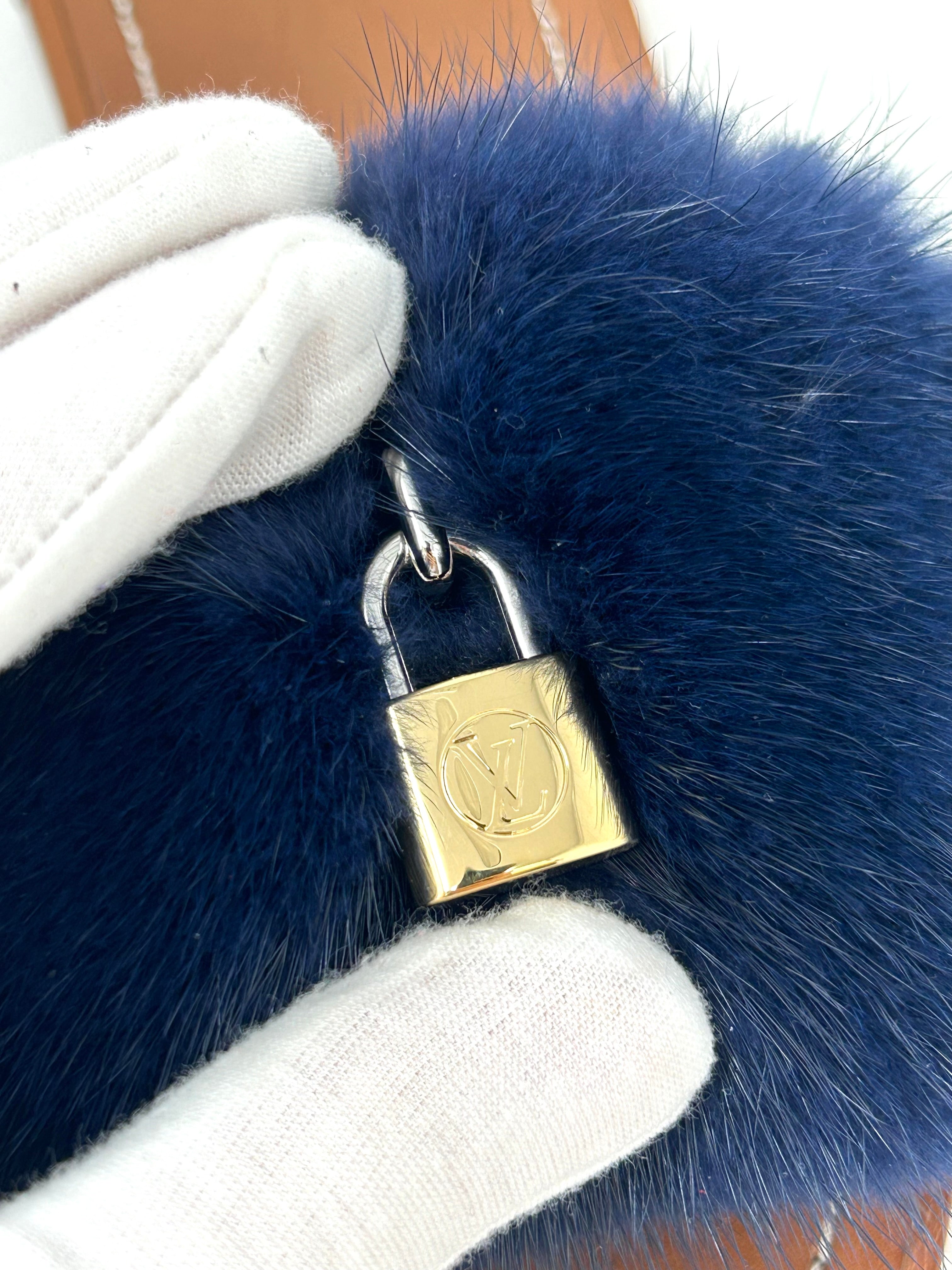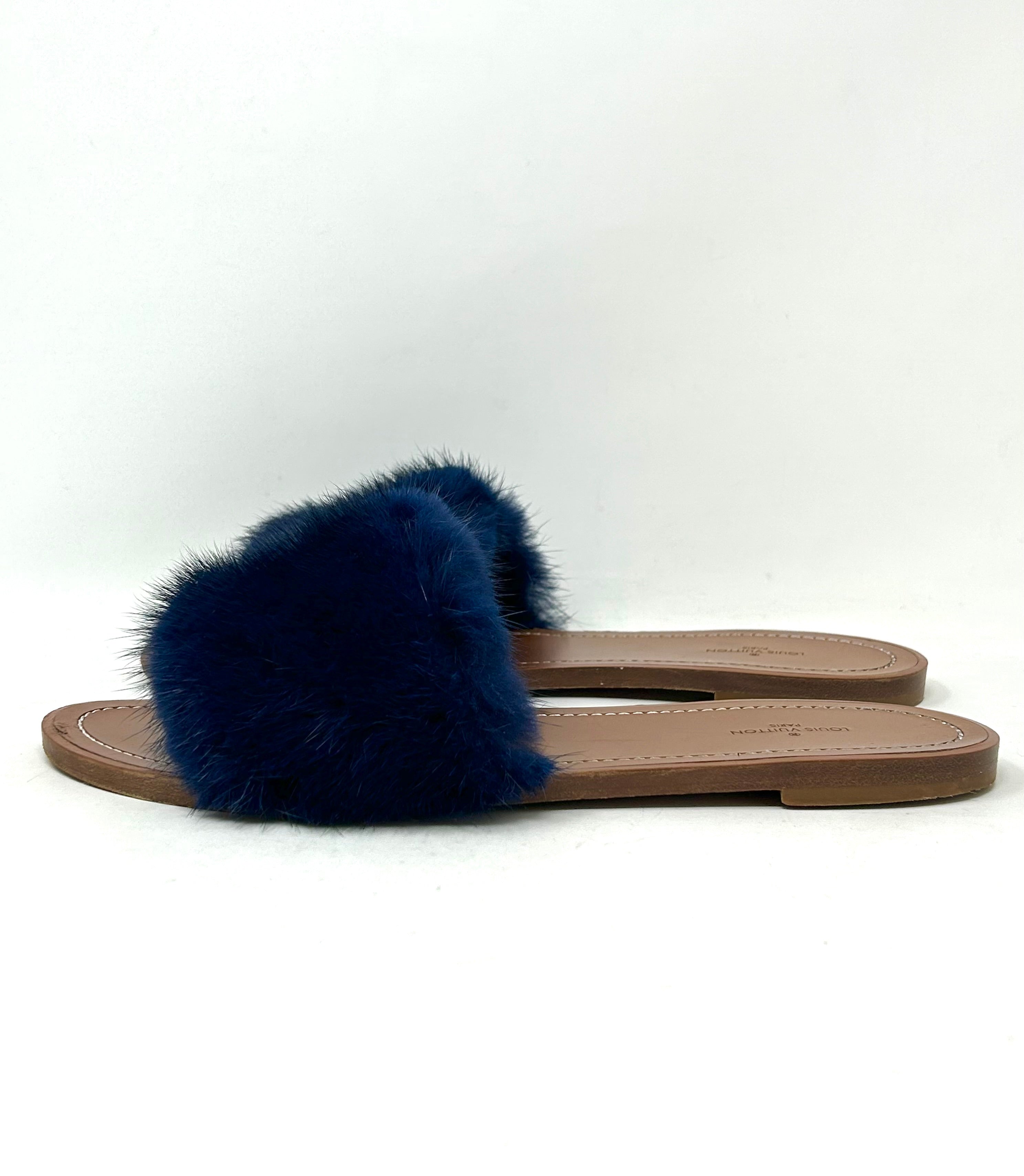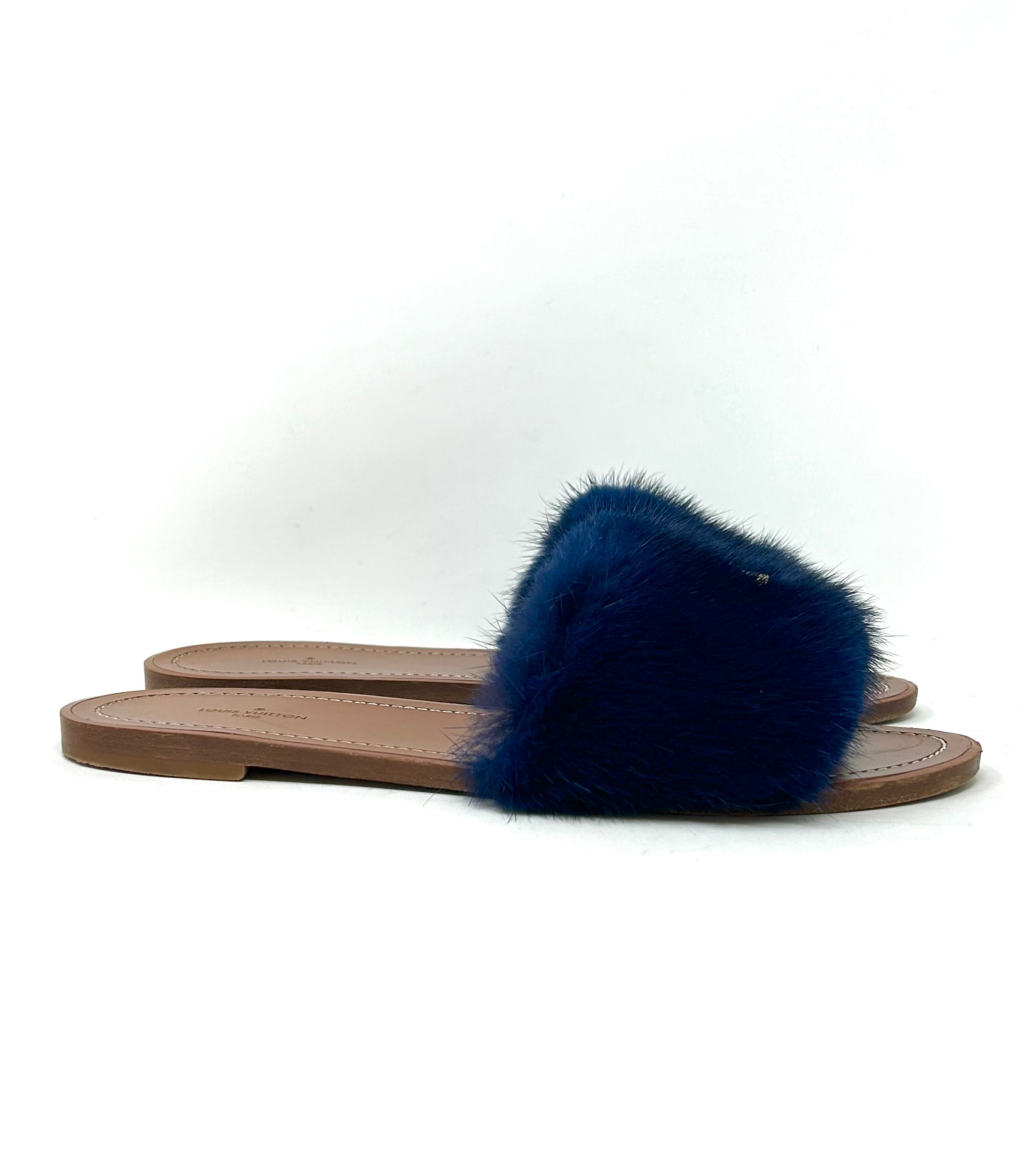 Louis Vuitton Lock It Brown Leather Dark Blue Mink Fur Slides Sandals 39 UK 6